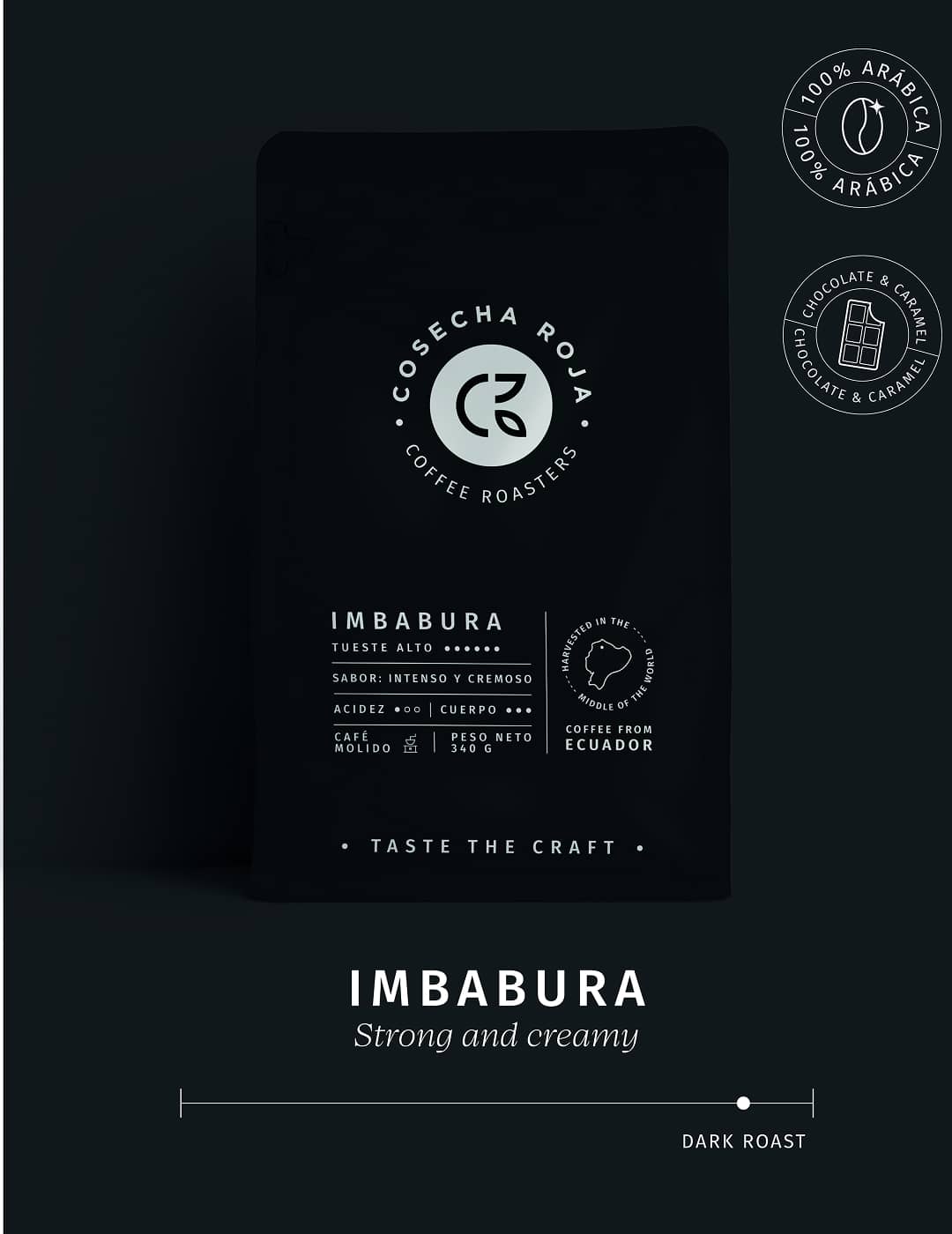 Imbabura de Cosecha Roja es un café molido de alta intensidad, elaborado con granos 100% arábigos cultivados en las faldas andinas del norte de Ecuador. Su tueste alto resalta sabores profundos y cremosos, con una acidez muy baja (1/3) y un cuerpo robusto (3/3), ideal para quienes prefieren una taza fuerte, redonda y con presencia.