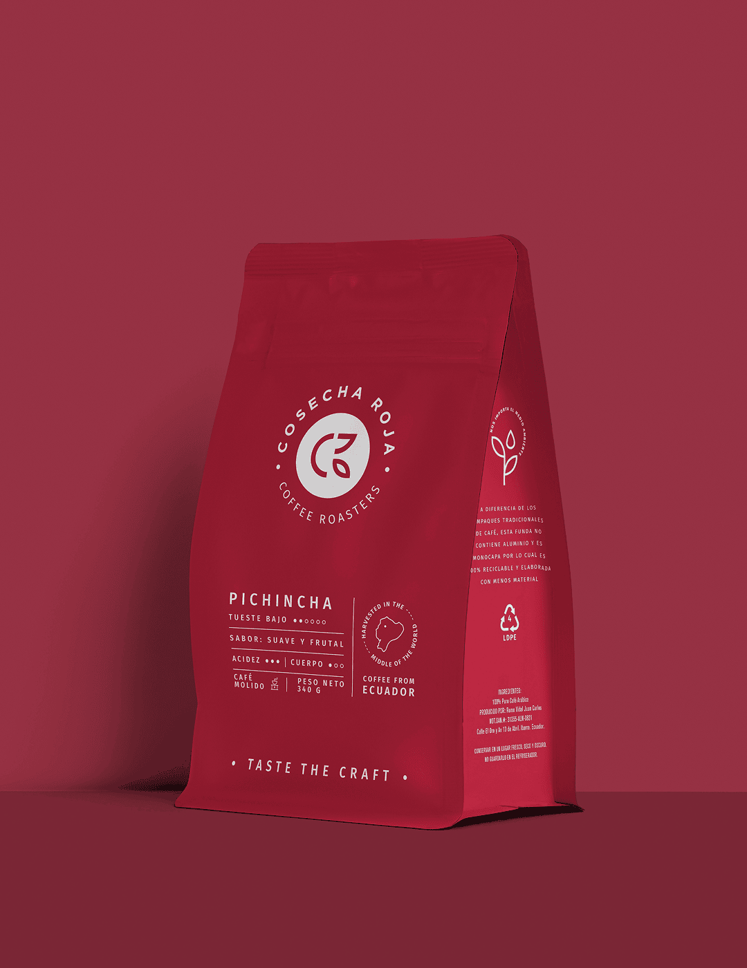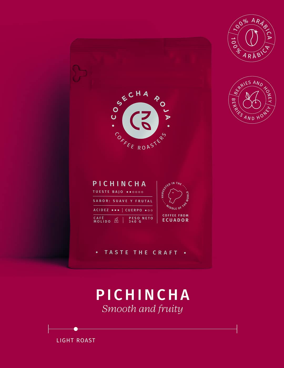Pichincha de Cosecha Roja es un café molido 100% arábigo que captura la esencia de las tierras altas del Ecuador. Con un tueste bajo que preserva toda la complejidad natural del grano, este café destaca por su sabor suave y frutal, su alta acidez (3/3) y su cuerpo ligero (1/3).